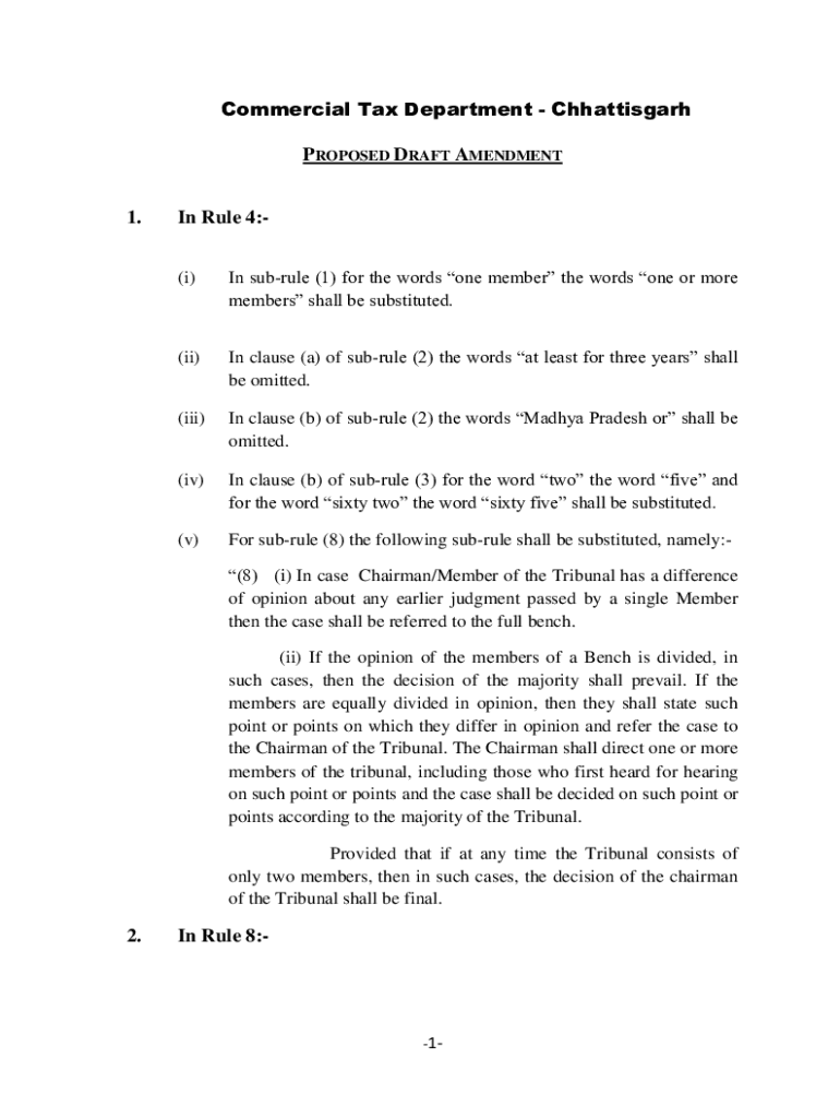 Commercial Tax Department Chhattisgarh PROPOSED DRAFT AMENDMENT 1. In Rule 4:(i)In subrule (1) for the words one member the words one or more members shall be substituted.(ii)In clause (a) of subrule