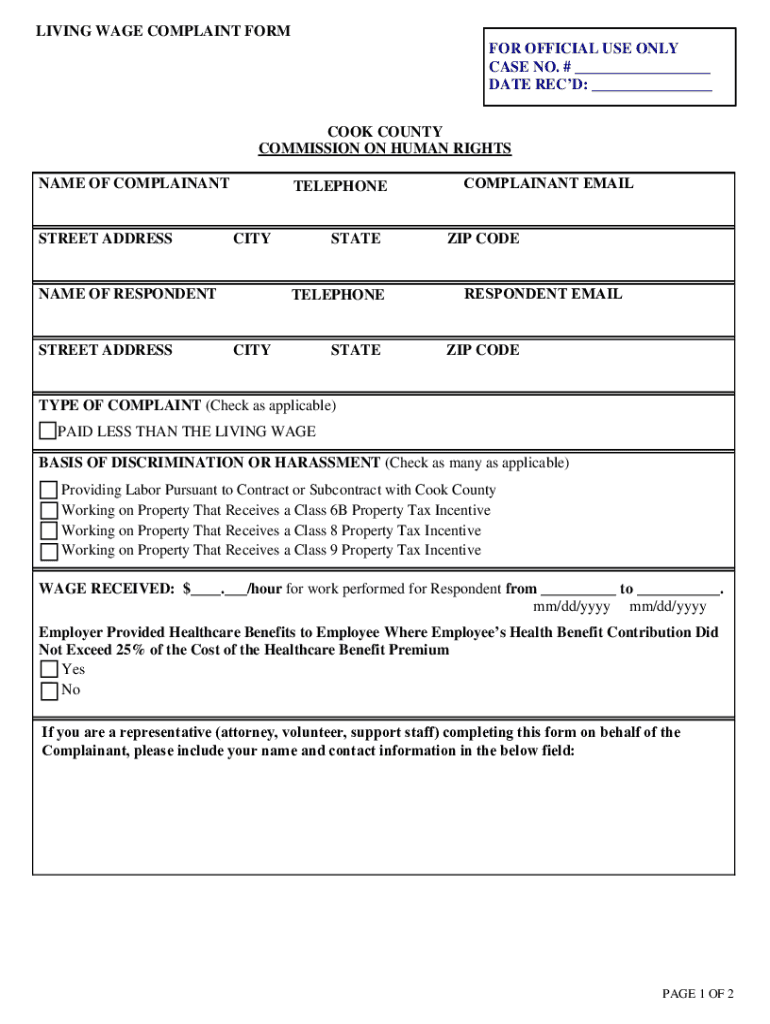 LIVING WAGE COMPLAINT FORM FOR OFFICIAL USE ONLY CASE NO. # ___ DATE RECD: ___ COOK COUNTY COMMISSION ON HUMAN RIGHTS NAME OF COMPLAINANTSTREET ADDRESSTELEPHONECITYTELEPHONENAME OF RESPONDENTSTREET