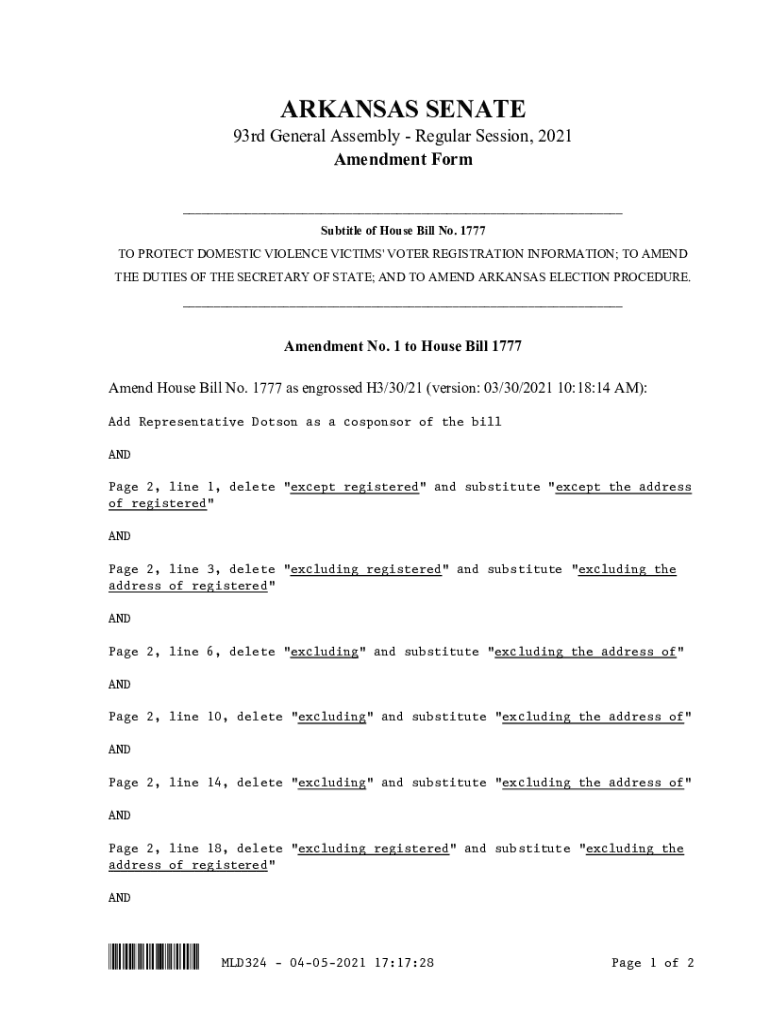 ARKANSAS SENATE 93rd General Assembly Regular Session, 2021 Amendment Form ___ Subtitle of House Bill No. 1777 TO PROTECT DOMESTIC VIOLENCE VICTIMS\' VOTER REGISTRATION INFORMATION; TO AMEND THE DUTIES