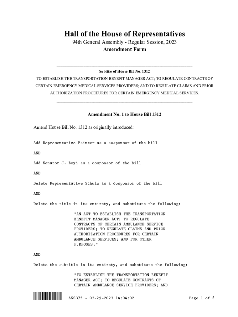 Hall of the House of Representatives 94th General Assembly Regular Session, 2023 Amendment Form ___ Subtitle of House Bill No. 1312 TO ESTABLISH THE TRANSPORTATION BENEFIT MANAGER ACT; TO REGULATE