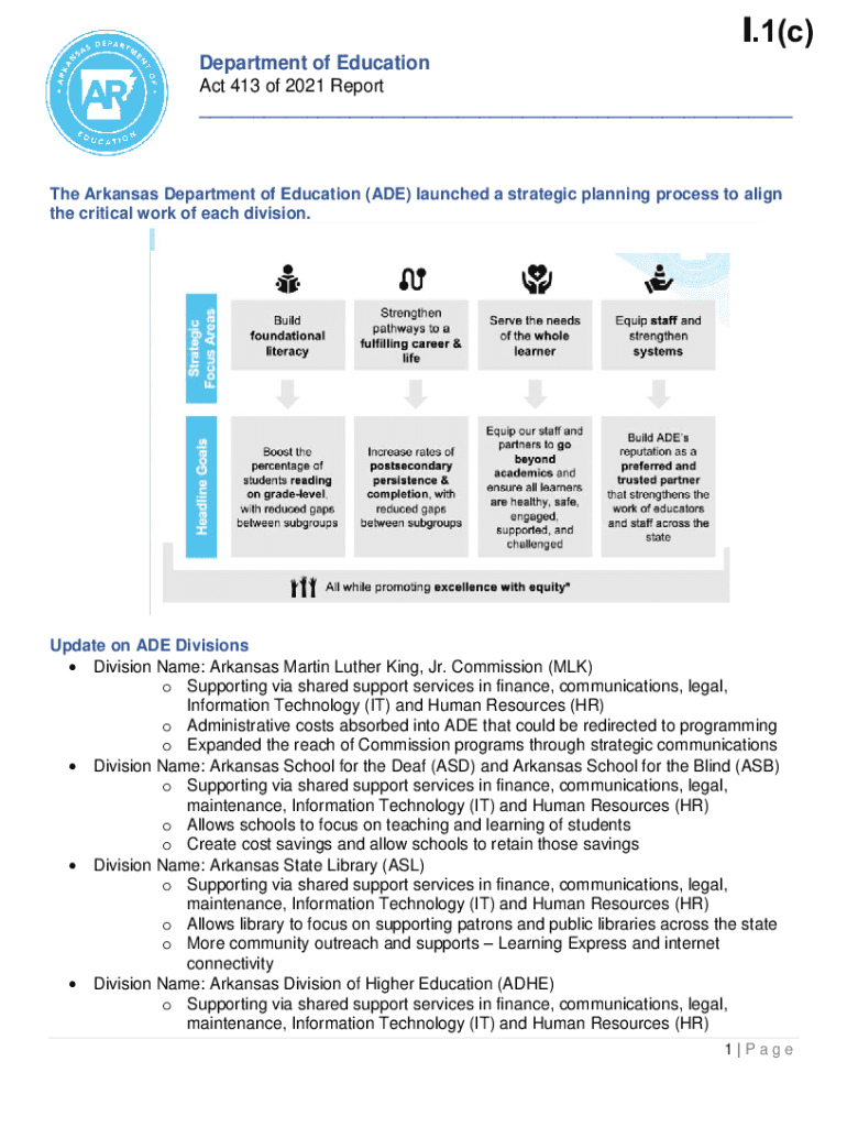 I.1© Department of Education Act 413 of 2021 Report___The Arkansas Department of Education (ARE) launched a strategic planning process to align the critical work of each division. Update on ARE Divisions