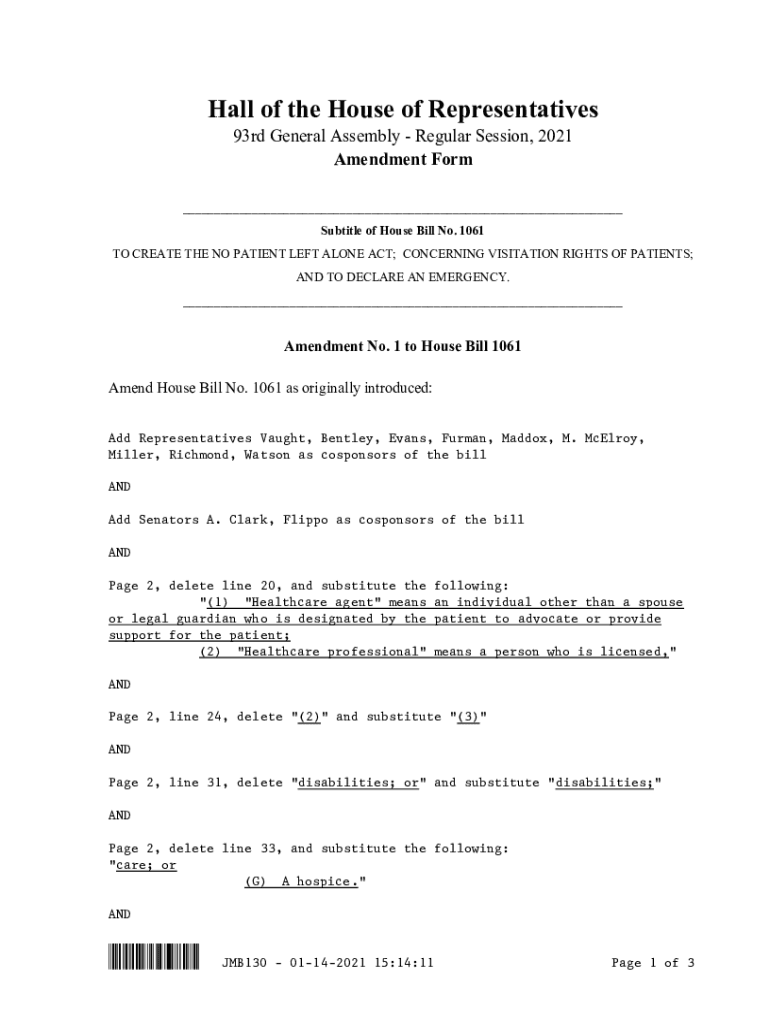 Hall of the House of Representatives 93rd General Assembly Regular Session, 2021 Amendment Form ___ Subtitle of House Bill No. 1061 TO CREATE THE NO PATIENT LEFT ALONE ACT; CONCERNING VISITATION RIGHTS