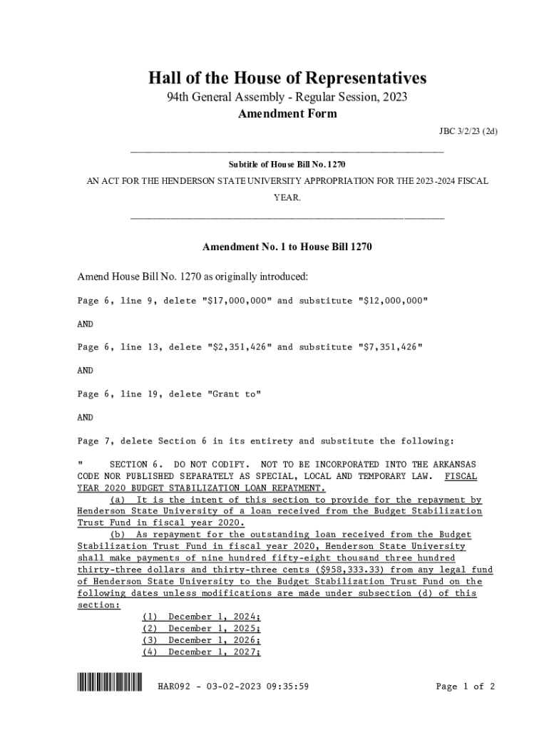 Hall of the House of Representatives 94th General Assembly Regular Session, 2023 Amendment Form BBC 3/2/23 (2d) ___ Subtitle of House Bill No. 1270 AN ACT FOR THE HENDERSON STATE UNIVERSITY APPROPRIATION