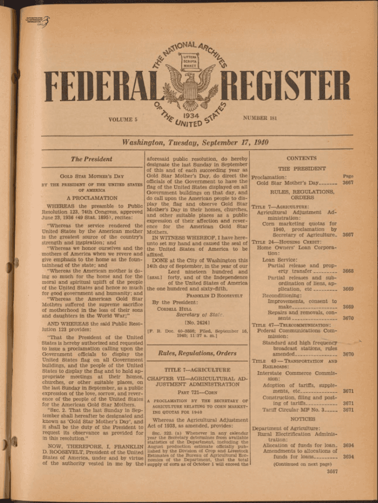 VOLUME 5^NUMBER 181,Washington Tuesday, September 17, 1940, The President G old S tar M other\' s Day BY THE PRESIDENT OF THE UNITED STATES OF AMERICACONTENTS aforesaid public resolution, do hereby