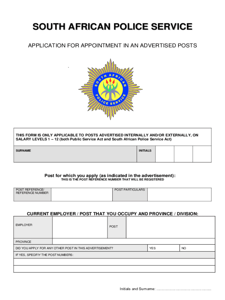 SOUTH AFRICAN POLICE SERVICE APPLICATION FOR APPOINTMENT IN AN ADVERTISED POSTS`THIS FORM IS ONLY APPLICABLE TO POSTS ADVERTISED INTERNALLY AND/OR EXTERNALLY, ON SALARY LEVELS 1 12 (both Public Service