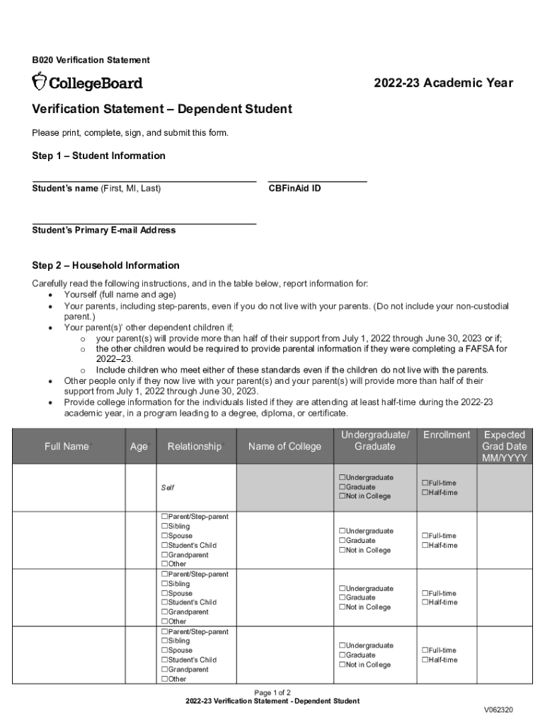B020 Verification Statement202223 Academic Year Verification Statement Dependent Student Please print, complete, sign, and submit this form. Step 1 Student Information Students name (First, MI, Last)CBFinAid