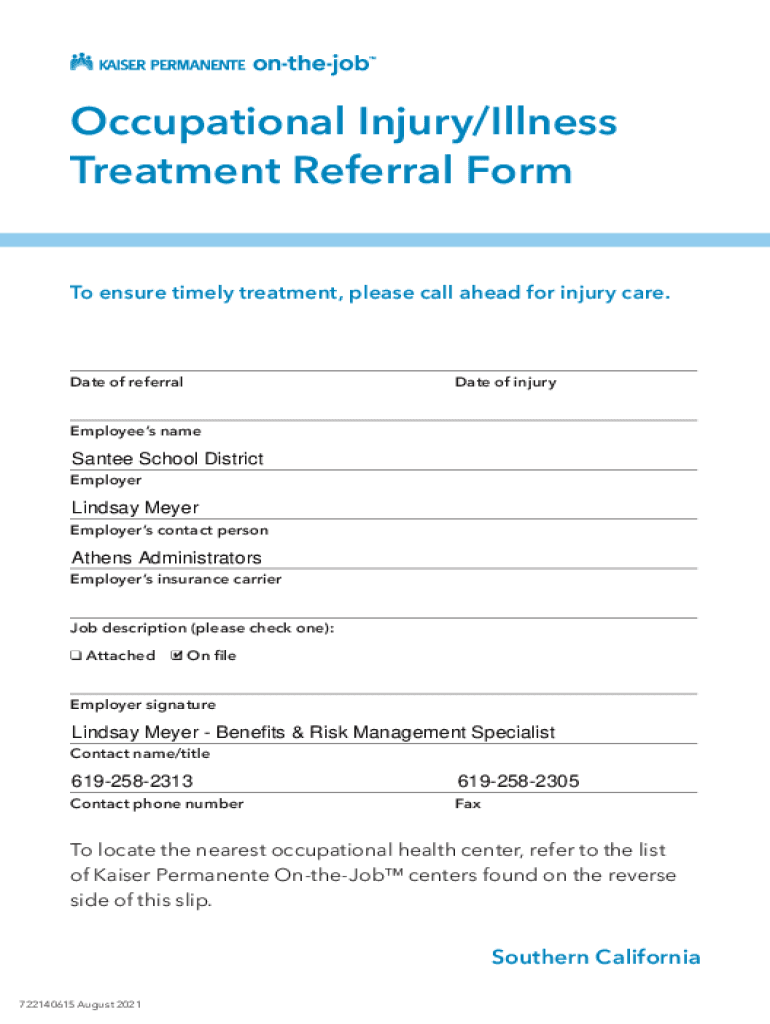 To ensure timely treatment, please call ahead for injury care. Date of referralDate of injuryEmployees namesake School District