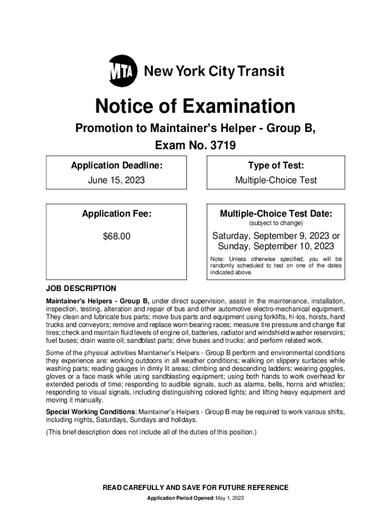 Notice of Examination Promotion to Maintainers Helper Group B, Exam No. 3719 Application Deadline:Type of Test:June 15, 2023MultipleChoice Misapplication Fee:MultipleChoice Test Date: (subject to