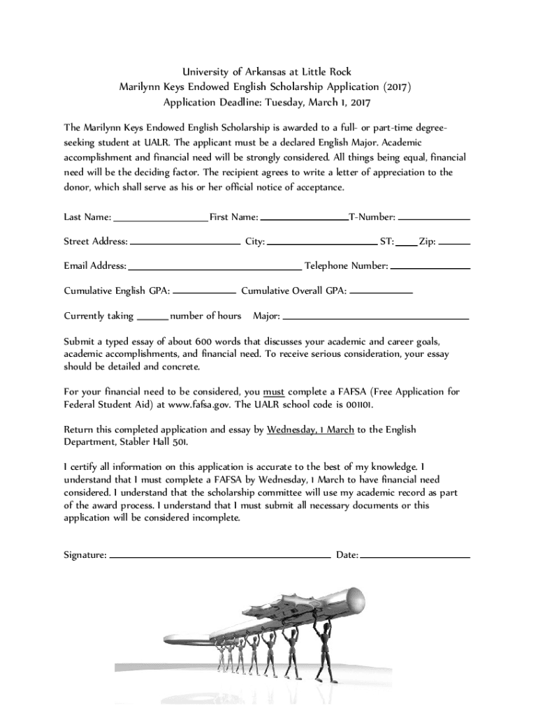 University of Arkansas at Little Rock Marilyn Keys Endowed English Scholarship Application (2017) Application Deadline: Tuesday, March 1, 2017 The Marilyn Keys Endowed English Scholarship is awarded