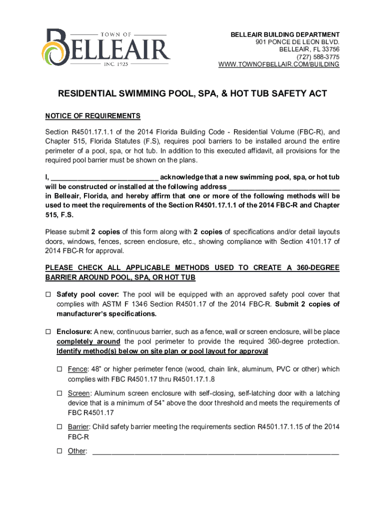 Bel Air BUILDING DEPARTMENT 901 PONCE DE LEON BLVD. Bel Air, FL 33756 (727) 5883775 WWW.TOWNOFBELLAIR.COM/BUILDINGRESIDENTIAL SWIMMING POOL, SPA, & HOT TUB SAFETY ACT NOTICE OF REQUIREMENTS Section