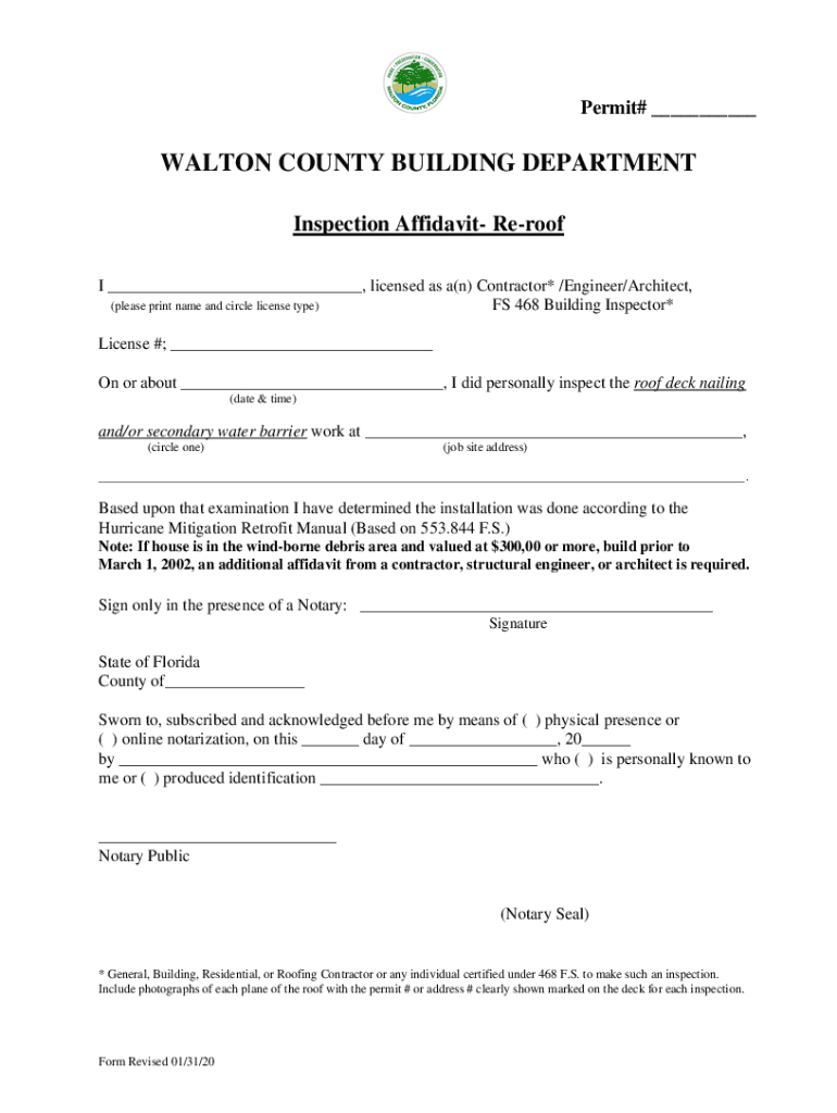 Permit# ___WALTON COUNTY BUILDING DEPARTMENT Inspection Affidavit Reproof I ___, licensed as a(n) Contractor* /Engineer/Architect, (please print name and circle license type) FS 468 Building Inspector*