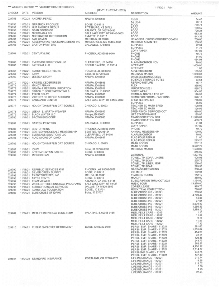 WEBSITE REPORTVICTORY CHARTER SCHOOL11/30/21Prin*(Moor: 112021112021) CHECK×DATEVENDORADDRESSDESCRIPTIONAMOUNTFOOD KETTLE FOOD FOOD FOOD HS A S S I S T. C R O S S C O U N T R Y C O A C H M E D I
