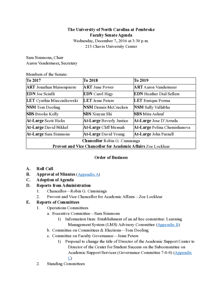 The University of North Carolina at Pembroke Faculty Senate Agenda Wednesday, December 7, 2016, at 3:30 p.m. 213 Chaves University Center Sara Simmons, Chair Aaron Wanderer, Secretary Members of the