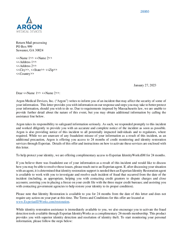 28950Return Mail processing PO Box 999 Suwanee, GA 30024 Name 1 Name 2 Address 1 Address 2 City, State Zip Country January 27, 2023, Dear Name 1 Name 2: Argon Medical Devices, Inc. (Argon) writes