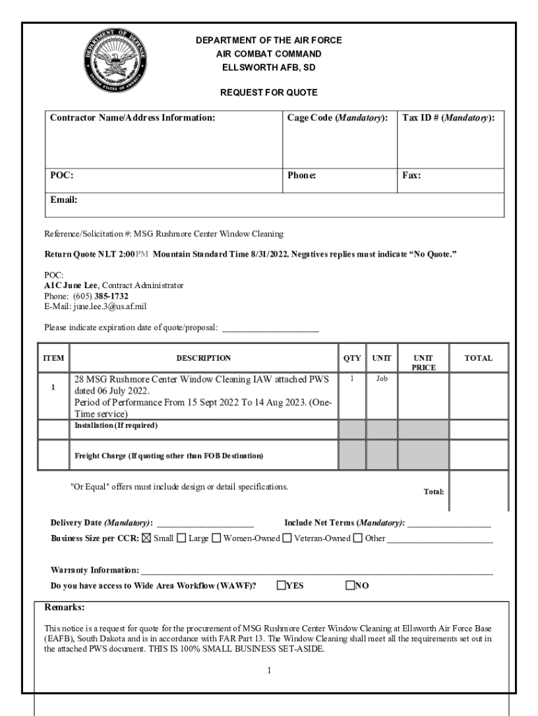 DEPARTMENT OF THE AIR FORCE AIR COMBAT COMMAND ELLSWORTH AFB, SD REQUEST FOR QUOTEContractor Name/Address Information:Cage Code (Mandatory):Tax ID # (Mandatory):POC:Phone:Fax:Email: Reference/Solicitation