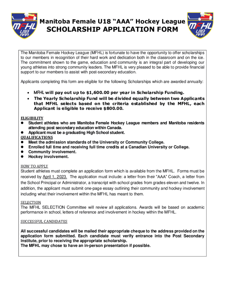 Manitoba Female U18 AAA Hockey LeagueSCHOLARSHIP APPLICATION Forth Manitoba Female Hockey League (MHL) is fortunate to have the opportunity to offer scholarships to our members in recognition of their