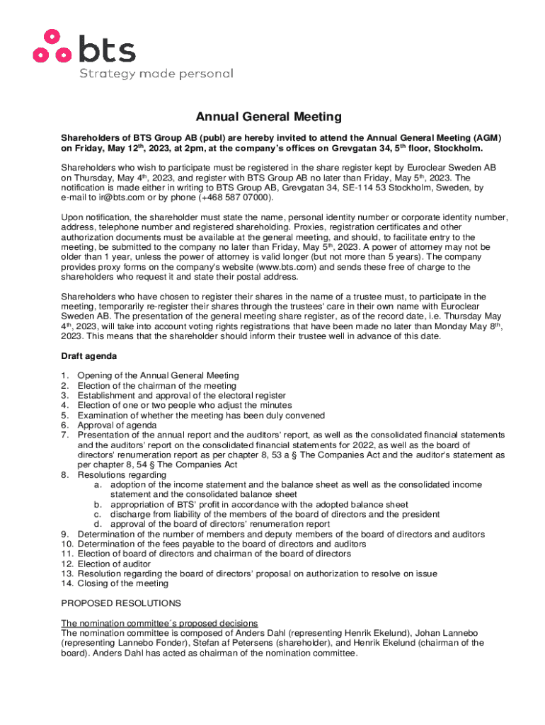 Annual General Meeting Shareholders of BTS Group AB (pub) are hereby invited to attend the Annual General Meeting (AGM) on Friday, May 12th, 2023, at 2pm, at the companies offices on Gravatar 34,