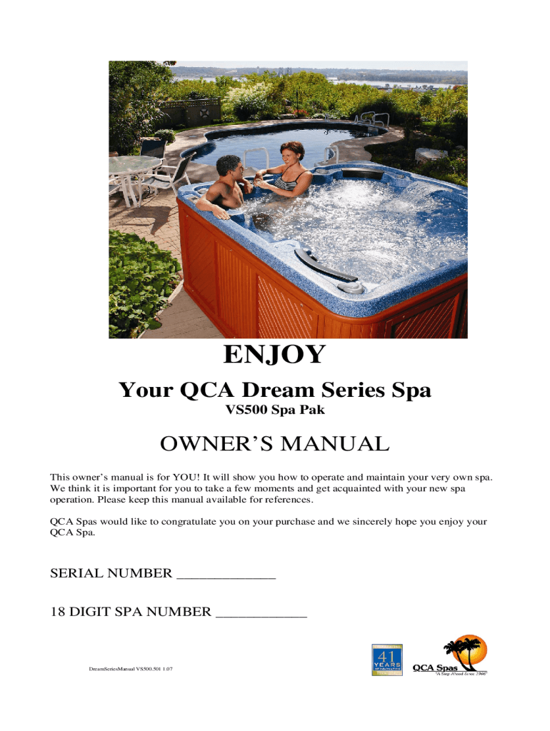 ENJOY Your QC Dream Series Spa VS500 Spa Owners MANUAL This owners manual is for YOU! It will show you how to operate and maintain your very own spa. We think it is important for you to take a few