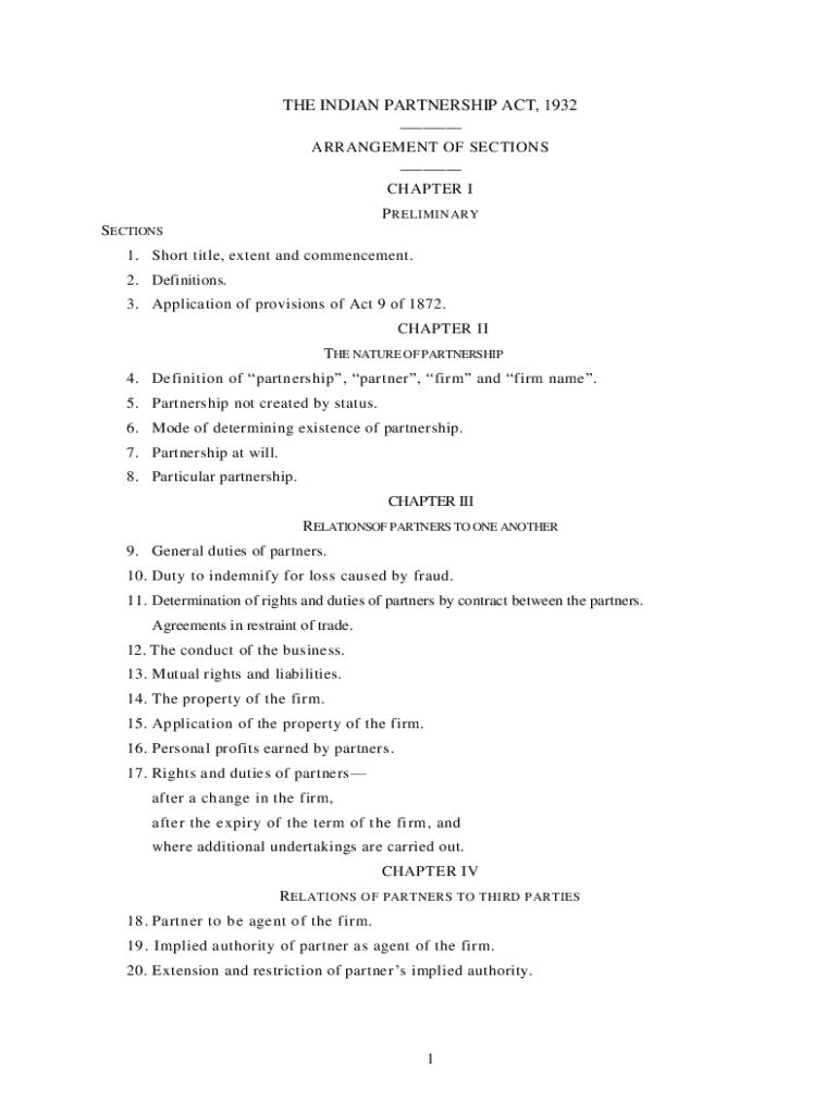 THE INDIAN PARTNERSHIP ACT, 1932 ___ ARRANGEMENT OF SECTIONS ___ CHAPTER I P PRELIMINARY SECTIONS 1. Short title, extent and commencement. 2. Definitions. 3. Application of provisions of Act 9 of
