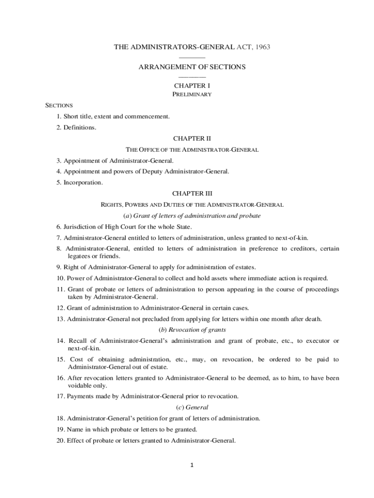 THE ADMINISTRATORSGENERAL ACT, 1963 ___ ARRANGEMENT OF SECTIONS ___ CHAPTER I PRELIMINARY SECTIONS 1. Short title, extent and commencement. 2. Definitions. CHAPTER II THE OFFICE OF THE ADMINISTRATORGENERAL