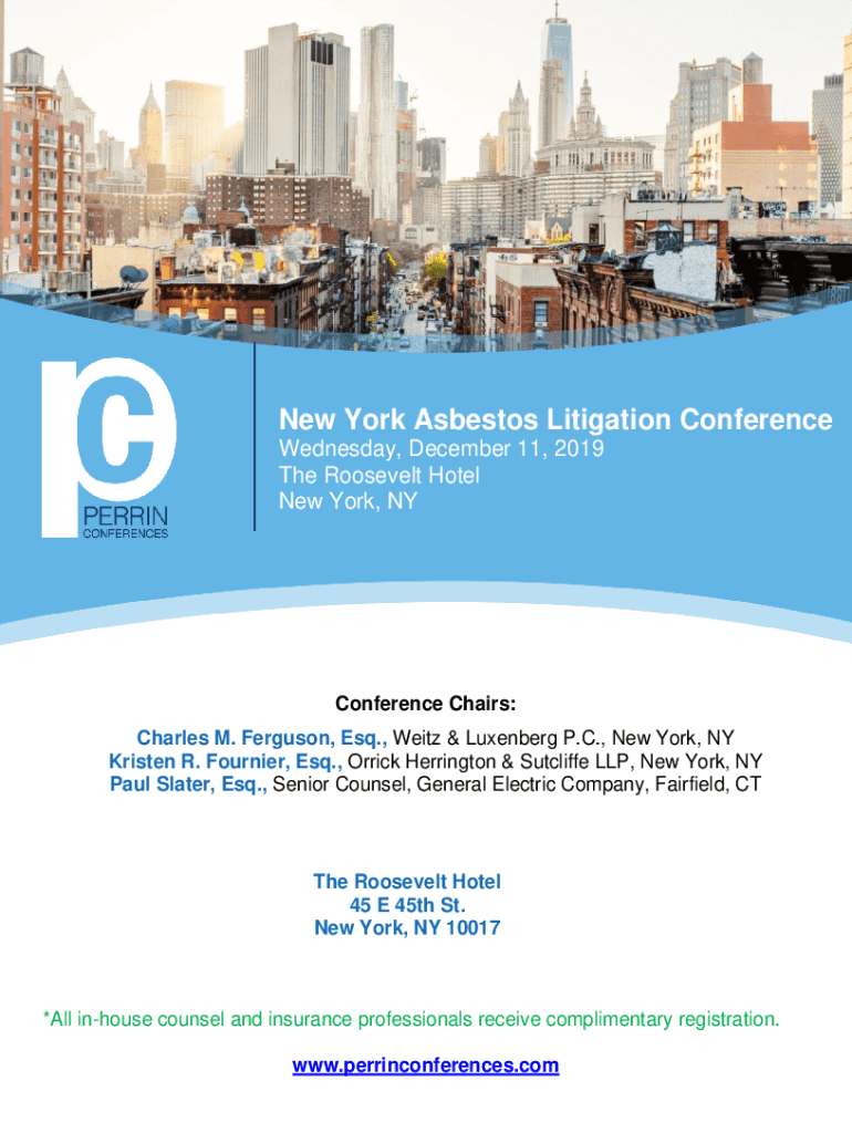 New York Asbestos Litigation Conference Wednesday, December 11, 2019, The Roosevelt Hotel New York, Conference Chairs: Charles M. Ferguson, Esq., Watt & Gutenberg P.C., New York, NY Kristen R. Fournier,