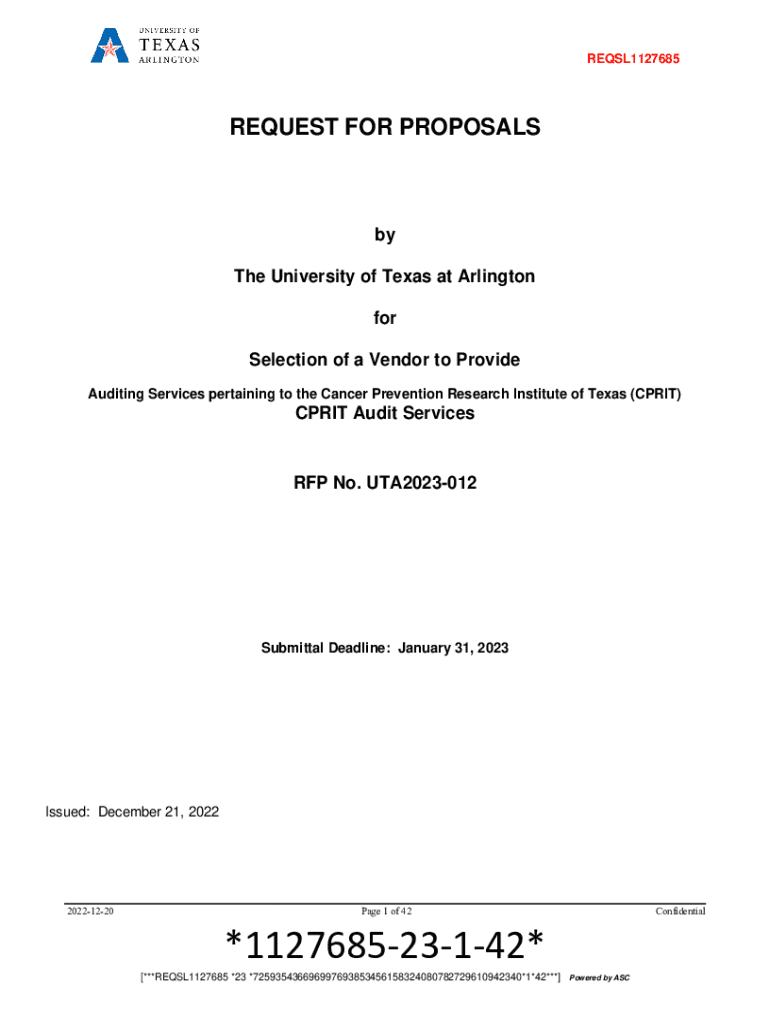 REQSL1127685REQUEST FOR PROPOSALS by The University of Texas at Arlington for Selection of a Vendor to Provide Auditing Services pertaining to the Cancer Prevention Research Institute of Texas (CPR