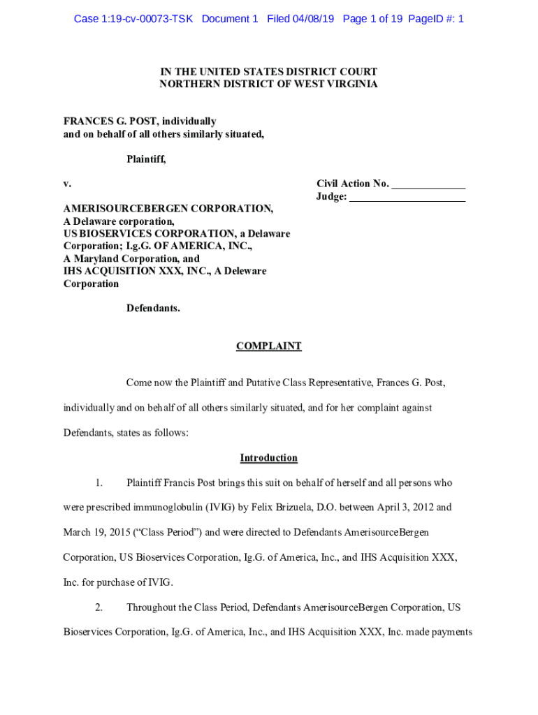 Case 1:19cv00073TSK Document 1 Filed 04/08/19-Page 1 of 19 Paged #: 1IN THE UNITED STATES DISTRICT COURT NORTHERN DISTRICT OF WEST VIRGINIA FRANCES G. POST, individually and on behalf of all others