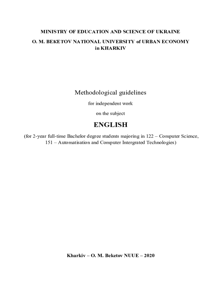 MINISTRY OF EDUCATION AND SCIENCE OF UKRAINE O. M. BTV NATIONAL UNIVERSITY of URBAN ECONOMY in KHARKIVMethodological guidelines for independent work on the subjectENGLISH (for 2year full time Bachelor
