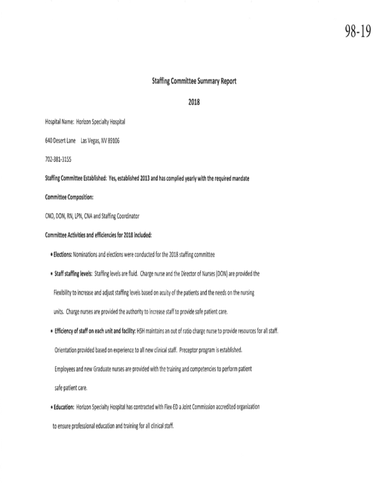9819 Staffing Committee Summary Report2018 Hospital Name: Horizon Specialty Hospital640 Desert Lane Las Vegas, NV 891067023813155 Staffing Committee Established: Yes, established 2013 and has complied