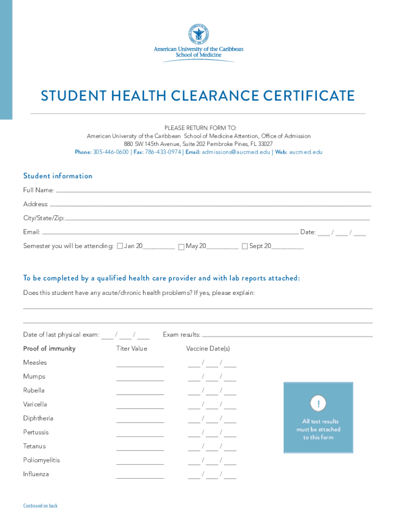 STUDENT HEALTH CLEARANCE CERTIFICATE PLEASE RETURN FORM TO: American University of the Caribbean School of Medicine Attention, Office of Admission 880 SW 145th Avenue, Suite 202 Pembroke Pines, FL