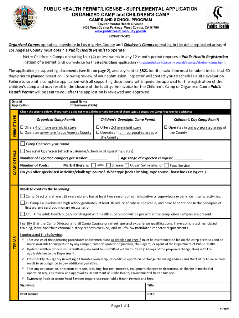 PUBLIC HEALTH PERMIT/LICENSE SUPPLEMENTAL APPLICATION