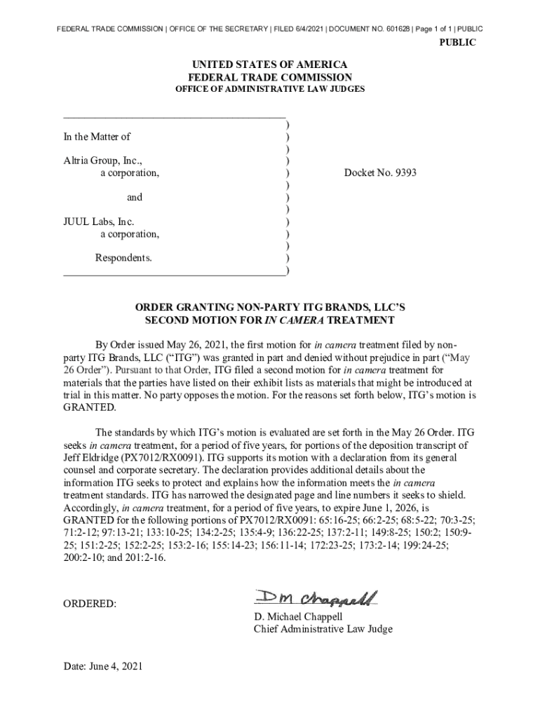 FEDERAL TRADE COMMISSION | OFFICE OF THE SECRETARY | FILED 6/4/2021 | DOCUMENT NO. 601628 | Page 1 of 1 | PUBLICPUBLICUNITED STATES OF AMERICA FEDERAL TRADE COMMISSIONOFFICE OF ADMINISTRATIVE LAW