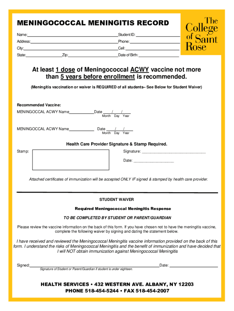 Name:Student ID:Address:Phone:City:Cell:State:Zip:Date of Birth:At least 1 dose of Meningococcal ACHY vaccine not more