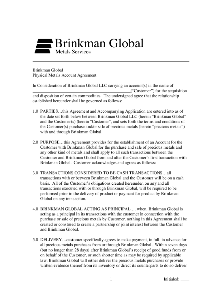 ___ Brink man Global Physical Metals Account Agreement In Consideration of Brink man Global LLC carrying an account(s) in the name of ___(Customer) for the acquisition and disposition of certain commodities.