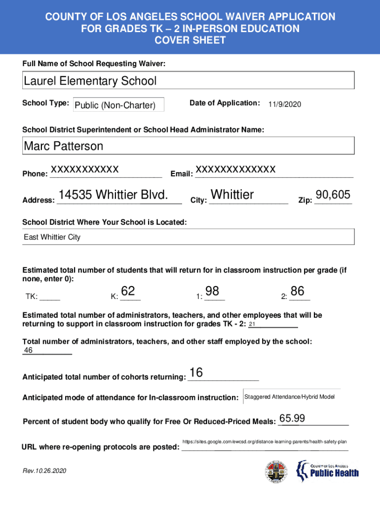 COUNTY OF LOS ANGELES SCHOOL WAIVER APPLICATION FOR GRADES TK 2 UNPERSON EDUCATION COVER SHEET Full Name of School Requesting Waiver:Laurel Elementary School Date of Application:School Type: Public