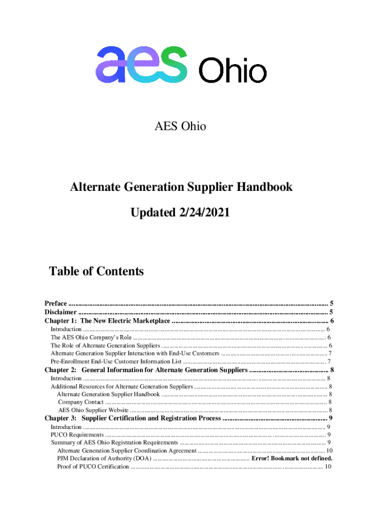 AES OhioAlternate Generation Supplier Handbook Updated 2/24/2021Table of Contents Preface .......................................................................................................................................................