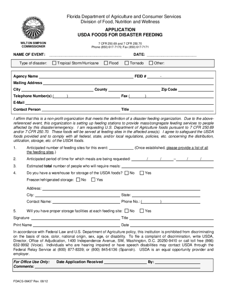 Florida Department of Agriculture and Consumer Services Division of Food, Nutrition and Wellness APPLICATION USDA FOODS FOR DISASTER FEEDING WILTON SIMPSON COMMISSIONERNAME OF EVENT:7 CFR 250.69 and