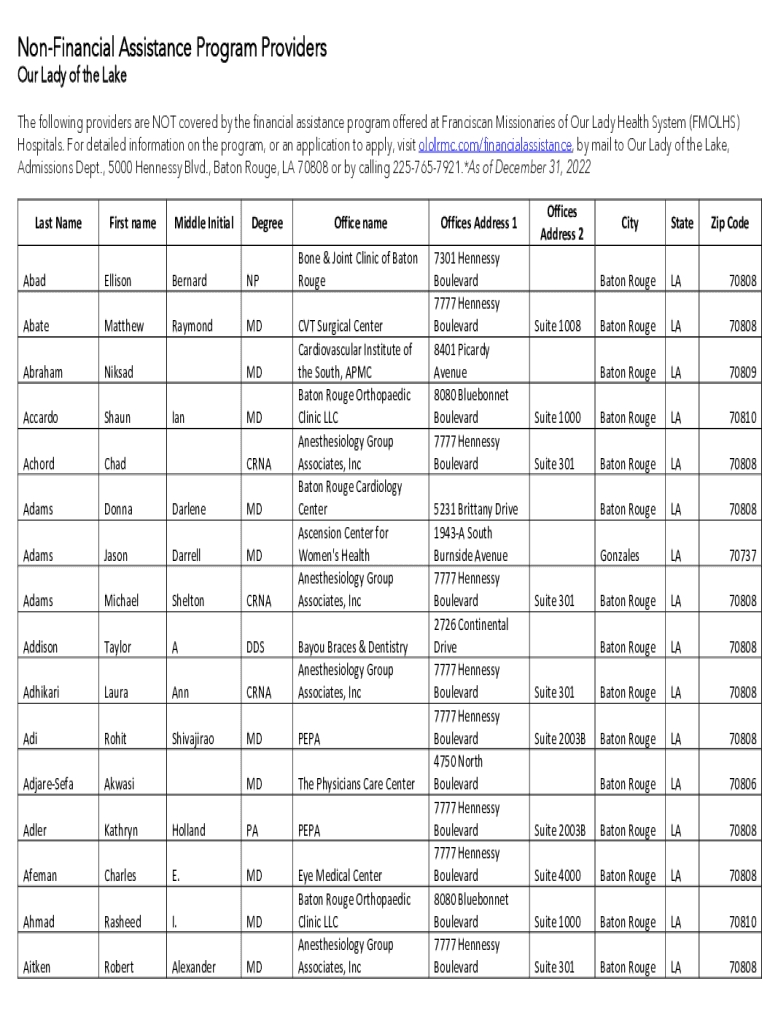 Financial Assistance Program Providers Our Lady of the Lake The following providers are NOT covered by the financial assistance program offered at Franciscan Missionaries of Our Lady Health System