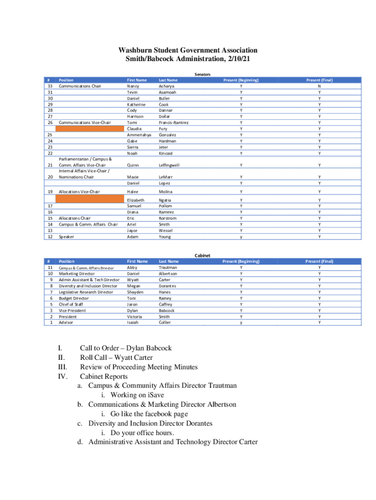 Washburn Student Government Association Smith/Babcock Administration, 2/10/21 Senators #PositionFirst Nameless Represent (Beginning)Present (Final)33 31 30 29 28 27 26Communications Chair Nancy Kevin