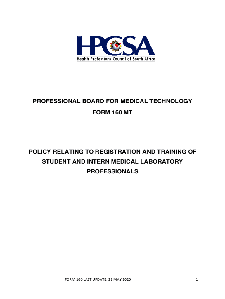 PROFESSIONAL BOARD FOR MEDICAL TECHNOLOGY FORM 160 POLICY RELATING TO REGISTRATION AND TRAINING OF STUDENT AND INTERN MEDICAL LABORATORY PROFESSIONALSFORM 160 LAST UPDATE: 29 MAY 20201TABLE OF CONTENTS1.DEFINITIONS