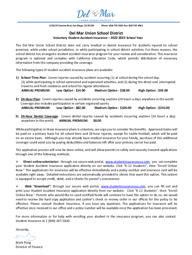 11232 El Camino Real, San Diego, CA 92130Phone: 8587559301 Fax: 8587554361Del Mar Union School District Voluntary Student Accident Insurance 20222023 School Year The Del Mar Union School District