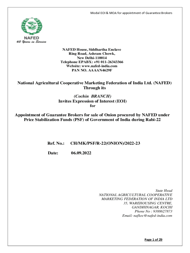Modal EOI & MOA for appointment of Guarantee BrokersNAFED House, Siddhartha Enclave Ring Road, Ashram Chow, New Delhi110014 Telephone PBX: +91 01126343366 Website: www.nafedindia.com PAN NO. AAAAN4629FNational