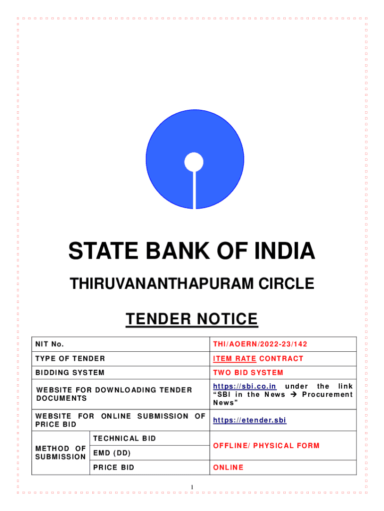 STATE BANK OF INDIA THIRUVANANTHAPURAM CIRCLE TENDER NOTICE NIT No. TH I / AO E R N / 2 0 2 2 2 3 / 1 4 2TY P E O F TE N D E RI TE M R AT E C O N T R AC TB I D D I N G S Y S TE MTW O B I D S Y S TE