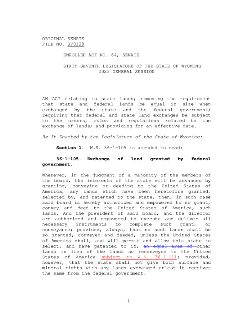 ORIGINAL SENATE FILE NO. SF0128 ENROLLED ACT NO. 64, SENATE SIXTEENTH LEGISLATURE OF THE STATE OF WYOMING 2023 GENERAL SESSION AN ACT relating to state lands; removing the requirement that state and
