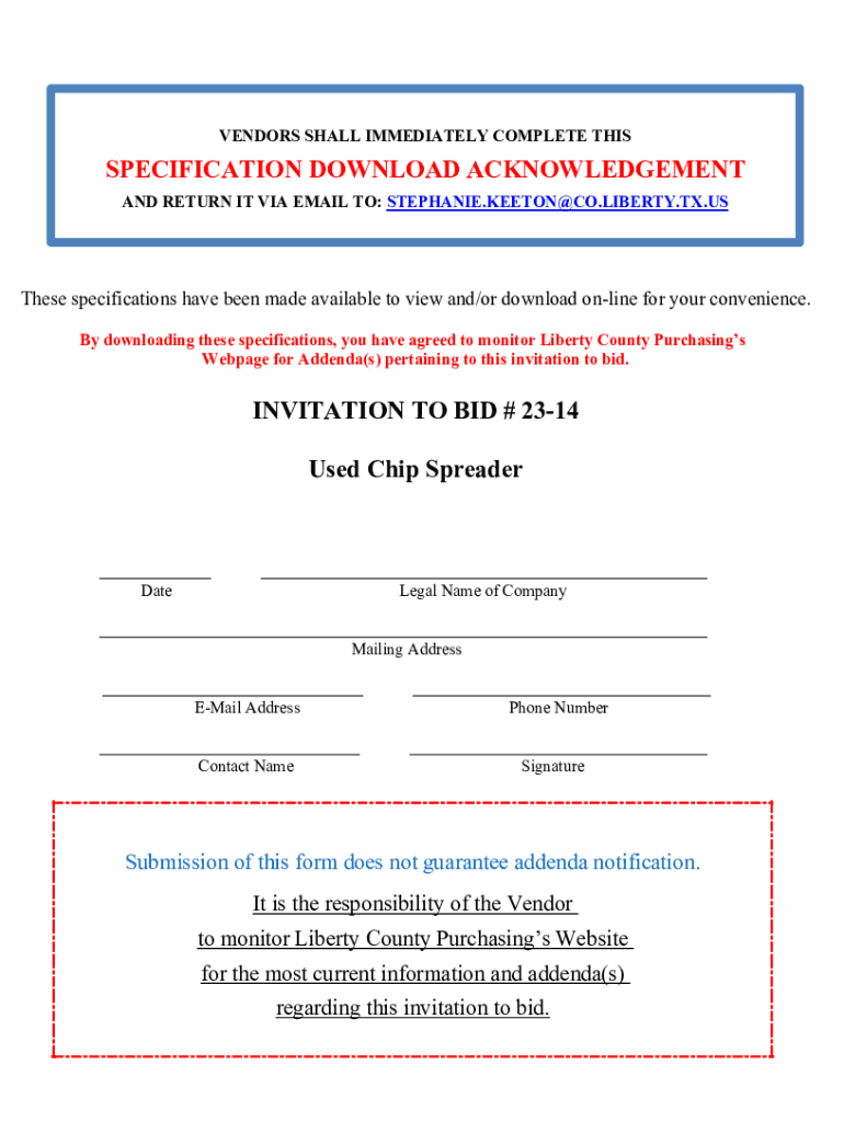 VENDORS SHALL IMMEDIATELY COMPLETE THISSPECIFICATION DOWNLOAD ACKNOWLEDGEMENT AND RETURN IT VIA EMAIL TO: STEPHANIE.KEETON@CO.LIBERTY.TX.USThese specifications have been made available to view and/or