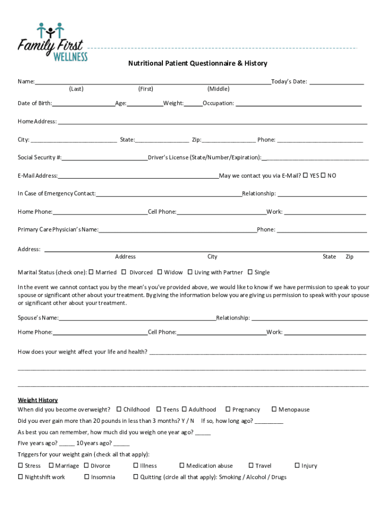 21 nutrition questionnaire templates are filled out by providing detailed information about food and beverage intake, dietary supplements, lifestyle habits, and health conditions.