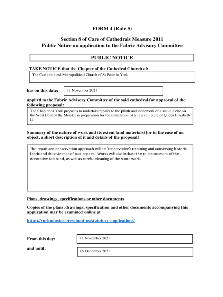 FORM 4 (Rule 5) Section 8 of Care of Cathedrals Measure 2011 Public Notice on application to the Fabric Advisory Committee PUBLIC NOTICE TAKE NOTICE that the Chapter of the Cathedral Church of: The
