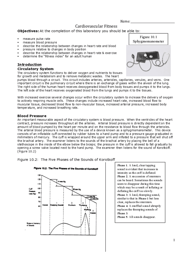 CardiovascularFitnessName:___Objectives: At the completion of this laboratory you should be able to: measure pulse rate measure blood pressure describe the relationship between changes in heart rate