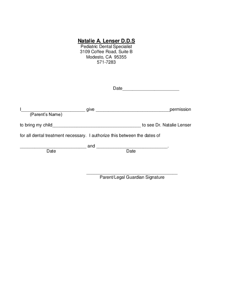 Natalie A. Lesser D.D.S Pediatric Dental Specialist 3109 Coffee Road, Suite B Modesto, CA 95355 5717283Date___I___ give ___permission (Parents Name) to bring my child___ to see Dr. Natalie Lesser
