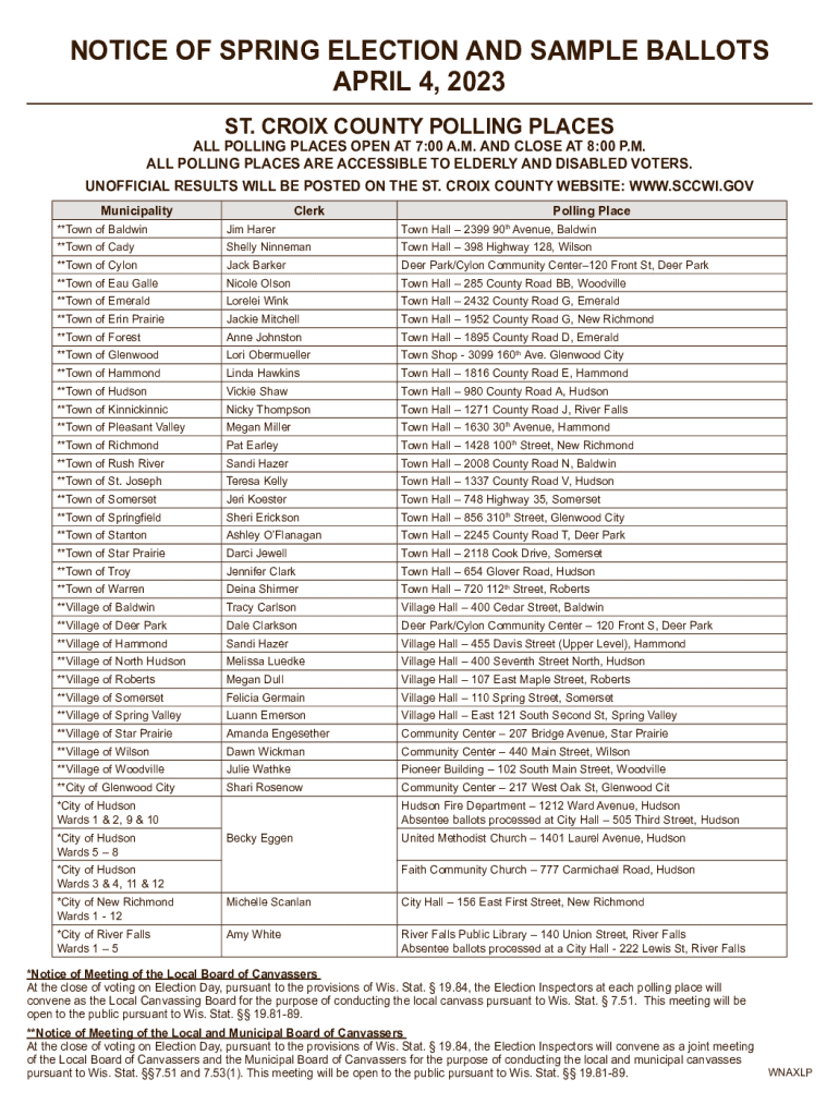 ST. CROIX COUNTY POLLING PLACES ALL POLLING PLACES OPEN AT 7:00 A.M. AND CLOSE AT 8:00 P.M.